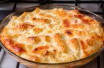 Intre timp se tapeteaza un vas termorezistent cu margarina si fulgi de proumb. Ouale se bat energic, adaugandu-se laptele si telemeaua rasa. In vasul tapetat se aseaza pastele, se toarna compozitia de oua, lapte si branza. Se rade...