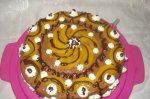 Blat : Se mixeaza bine ouale intregi cu zaharul pana isi dubleaza volumul. Se adauga apoi uleiul, putin cate putin, amestecand cu mixerul. Faina se amesteca cu cacao si praf de copt si se adauga cate putin in amestecul de oua, mixand la viteza mica. Se tapeteaza o tava 20x30 cm cu hartie de copt...