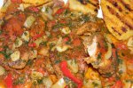 Pulpele de pui se curata si se taie bucati. Ceapa se curata si se toaca la robot, pana se face aproape pasta sau se da pe razatoarea fina. Maslinele se spala in apa rece si se pun la scurs. Se pune uleiul intr-o cratita si se prajesc bucatile de pulpa pana se albesc. Se adauga...