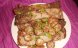 Muschiuletul de porc l-am curatat bine si apoi l-am taiat feliute, dar nu de tot si l-am asezat intr-un vas de iena. Alaturi am pus doi cartofi mari, spalati si curatati, taiati pe lung si apoi felii groase.