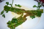 Spalam sparanghelul si indepartam coditele. le taiem de acolo de unde au elasticul legat. Punem apa la fiert si asezam sparanghelul la aburi timp de 5 minute. Scoatem sparanghelul si il legam in manunchiuri cu fire de patrunjel. Pregatim sosul:  Punem untul in tigaie, stoarcem...