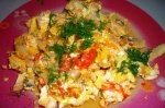Se pune uleiul in tigaie apoi legumele tocate marunt si se soteaza cinci minute, se adauga ouale putin batute cu un praf de sare...se decoreaza cu marar si daca se doreste se pune si branza rasa. O nebunie!