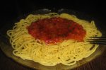 Spalam legumele si le trecem prin robot (ceapa, ardeiul si salata verde). Le calim in 3 linguri de ulei timp de 5 minute, apoi adaugam rosiile trecute prin robot. Condimentam, adaugam foaia de dafin si lasam sa fiarba la foc mic pana scade lichidul lasat. Fierbem spaghetele urmand...