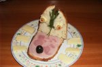 Feliem painea, asezam deasupra salam, sunca, cascaval si masline verzi.