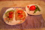 Feliile de pine se decupeaza cu formele de la fursecuri, apoi le punem la prajit in aparatul de senvisuri. Le frecam cu catelul de usturoi pe fiecare in parte apoi cu o pensula de silicon le ungem cu ulei le asezam pe platou si le ornam cu ardei rosu si castravete .potrivim de sare, in functie...