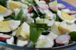 Leurda se spală, se lasă la scurs și se taie în bucăți de 3-4 cm, după care se pune într-un castron. Ouăle se curăță de coajă, se taie în sferturi și se pun peste leurdă. Castraveciorii se curăță de coajă și se taie rondele, la ridichi se înlătură...