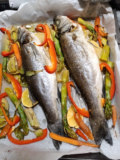 Biban de mare cu sparanghel, ardei și baby morcov - Rețeta rapidă și sănătoasă