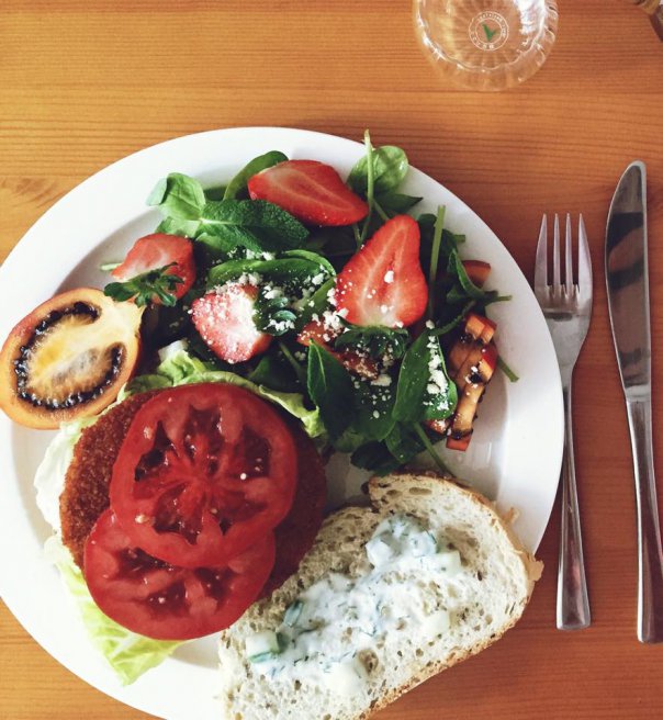 Burger vegetarian cu sos Tzatziki si salata de spanac cu tomarillo si capsuni