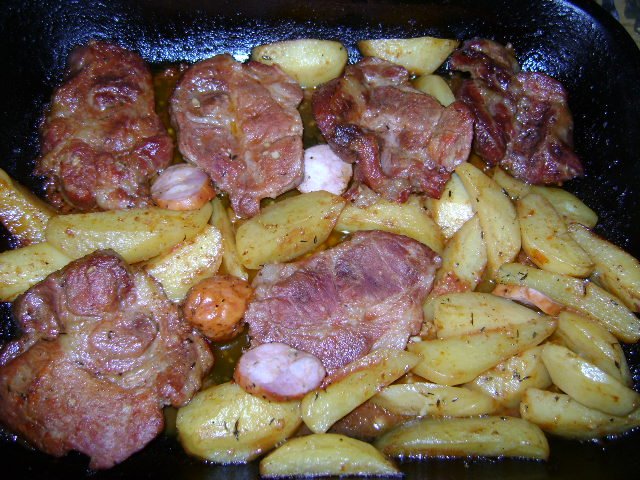 Ceafa de porc cu carnati ,cartofi si bere la cuptor