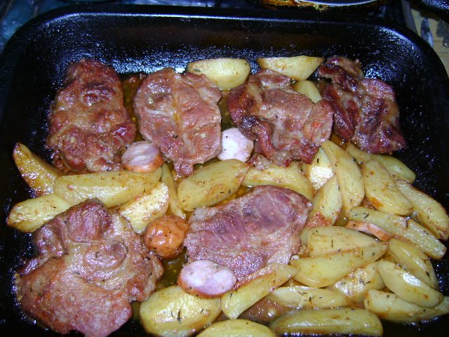 Ceafa de porc cu carnati ,cartofi si bere la cuptor
