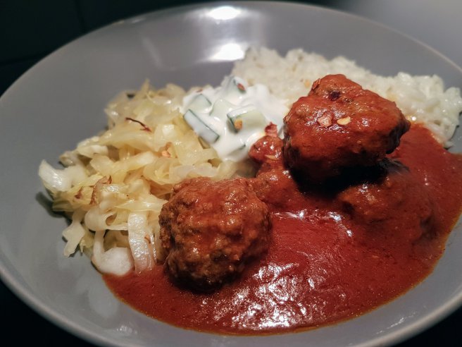 Chiftele in sos aromat de rosii si iaurt cu castraveti