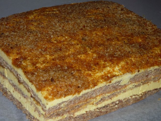 Desert prajitura cu nuci caramelizate, crema de vanilie si lamaie