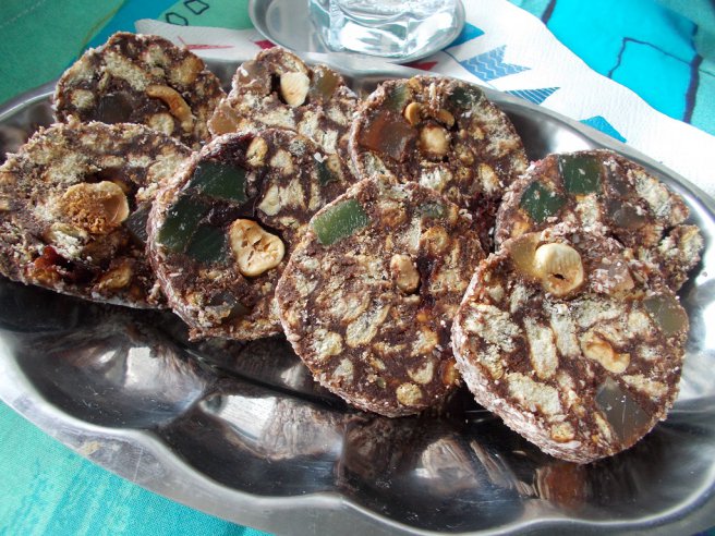 Desert salam de biscuiti cu unt, visine, nuca de cocos si alune de padure