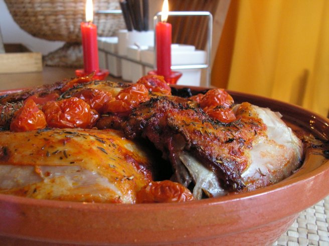 Friptura de pui cu cartofi si rosii cherry in sos de vin cu rozmarin si cimbru la vasul de lut, tajine