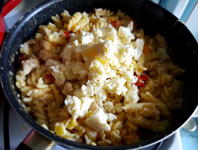 Fusilli cu pui, legume si branza de burduf, in lapte