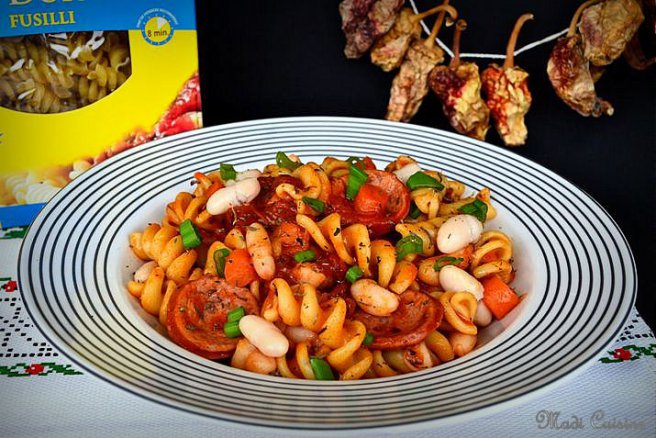 Fusilli cu sos de rosii, carnati si fasole cannellini