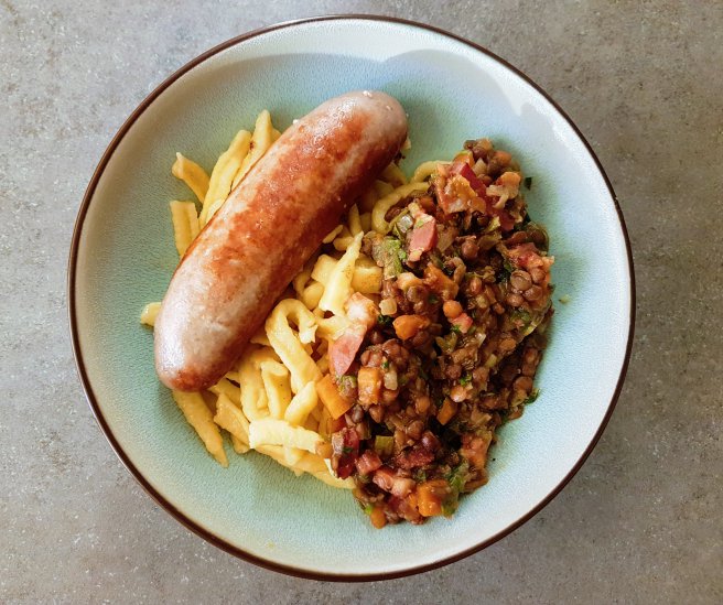 Linte in stil german cu Spatzle (taitei germani) si carnati