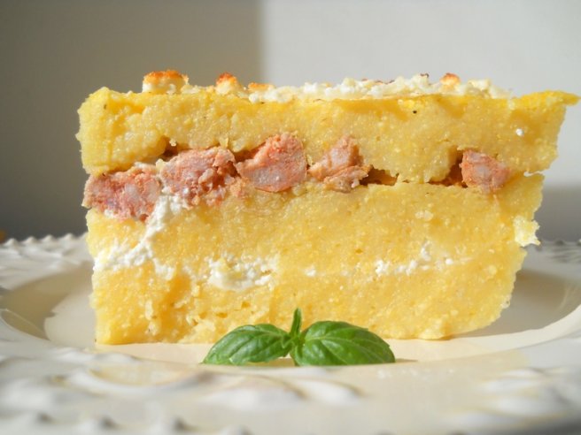 Mamaliguta in straturi cu branza si carnaciori