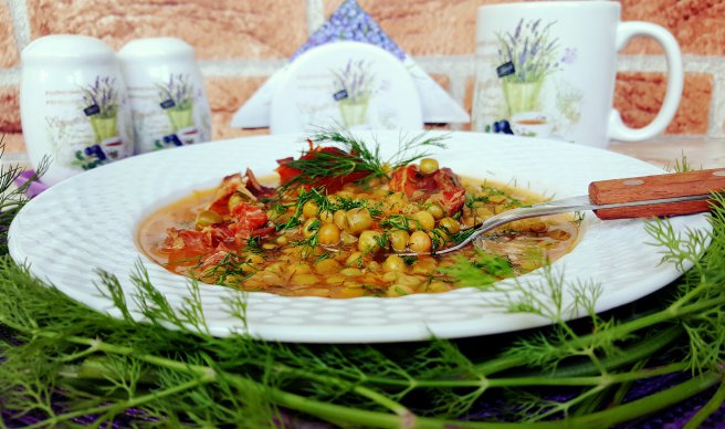 Mancare de mazare cu costita afumata si pastrama de porc-0