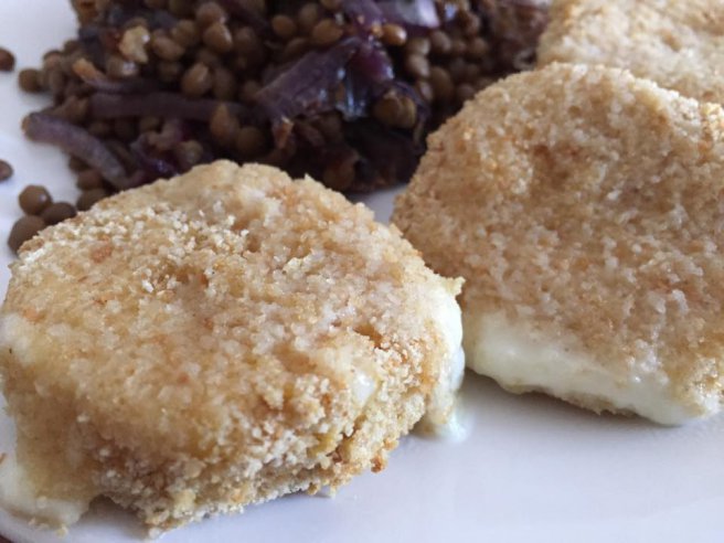 Mozzarella pane la cuptor cu salata calda de linte cu ceapa caramelizata