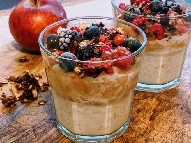 Orez cu lapte, piure de mar, granola si fructe de padure