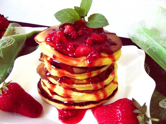 Pancakes cu jeleu de căpşuni şi coacăze roşii