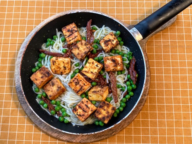 Paste de Konjac cu sos pesto, rosii uscate si tofu crispy la gratar-6