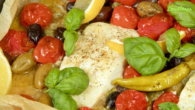 Pește la cuptor, cu roșii și măsline - Rețeta gustoasă și sănătoasă
