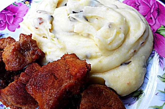 Piure de cartofi cu ciuperci si friptura de porc