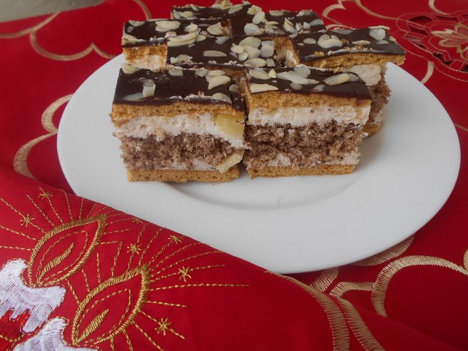 Prajitura cu blat de nuca, foi caramel si doua creme