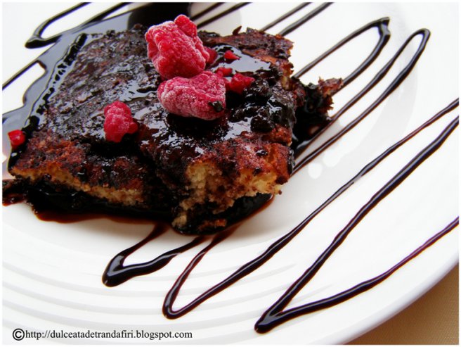 Prajitura-pudding cu sos de cafea si inghetata de vin rosu