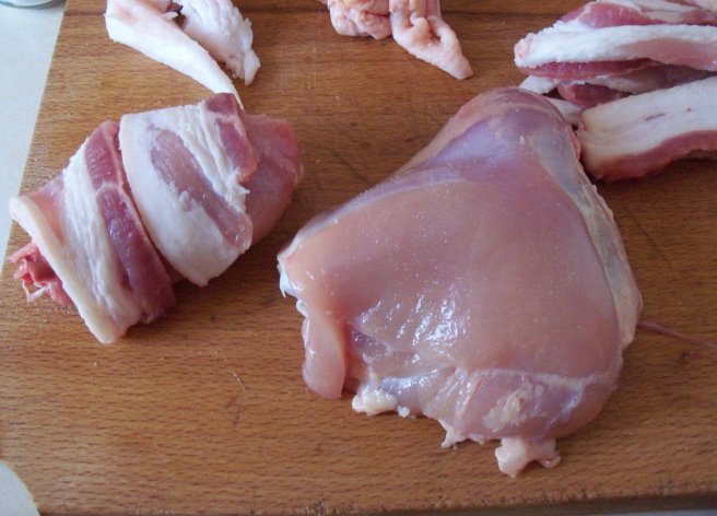 Pui invelit in piept de porc, cu bere si mirodenii la cuptor