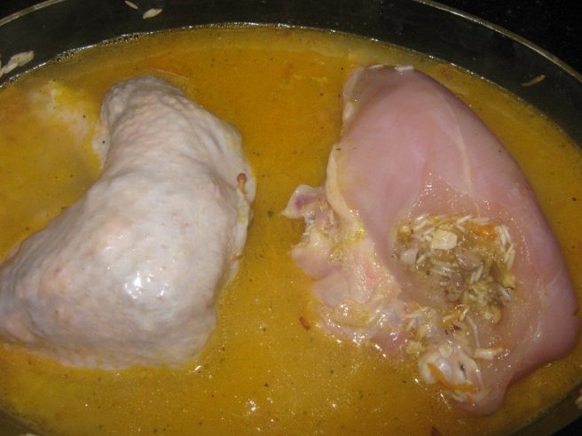 Pulpa si piept de pui umplute pe pat de orez la cuptor