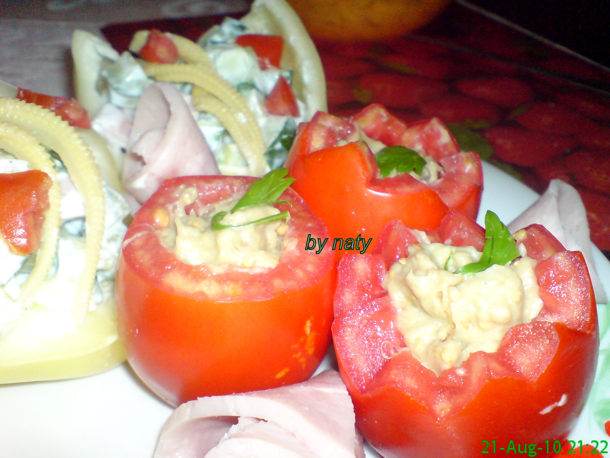 Rosii umplute cu salata de vinete si ardei umplut cu salata de castraveti