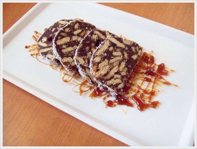 Salam de biscuiţi, reţetă cu fructe confiate