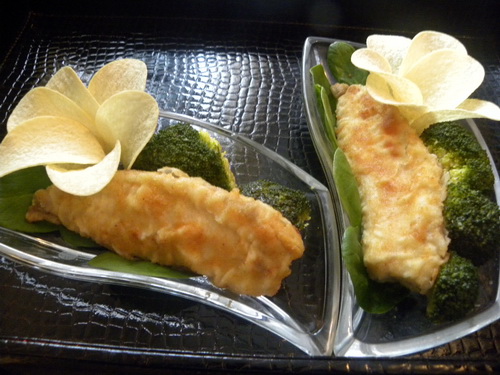 Tilapia pane cu garnitura de brocolli si chipsuri...