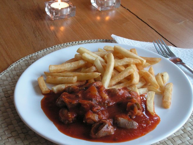 Tocanita de inimi si pipote de pui in sos de rosii