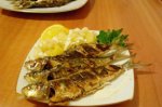 Sardine fripte pe grill cu cartofi natur și sos de usturoi