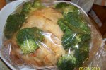 Se spala bine puiul ,se fac crestaturi pe piept ,copanele dupa care in condimentam bine peste tot ,ii facem( masaj cu condimete) brocoli spalat si desfacut in cat mai multe buchetele mici ,le condimentam si pe ele si bagam totul in punga pentru cuptor lasam punga la cuptor timp de...