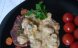 Se pune usturoiul intreg in uleiul de masline si se lasa 2 minute, dupa care se adauga cirnatul proaspat curatat de pielita si zdrobit si cartofii taiati cubulete, se adauga putina apa si se lasa la fiert pina e facut.Se condimenteaza cu sare si piper dupa gust si patrunjelul verde...