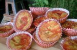 Branza de capra si telemeaua le-am dat pe razatoare, iar branza camembert am rupt-o in bucati mici. Am amestecat ouale cu smantana si condimentele (sare, piper, mix curry, oregano), am adaugat faina amestecata cu praful de copt, apoi branza rasa. Am pus hartie pentru briose in tava...