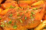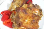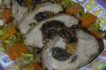 Bucata de cotlet se spala se lasa sa se zvante . Se sareaza carnea si cu un cutit se face pe lungime o taietura care se largeste si se umple cu fructe uscate . Legumele se curata si se taie bucati de cate 4 cm . Intr-un bol se pune usturoiul tocat marunt si se amesteca cu...