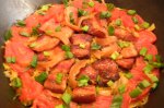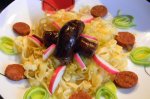 Pastele se fierb in apa cu sare a la dente [ sa ramana mai ferme ] .Scurgeti pastele si pastrati 100-150 ml din apa in care au fiert . Portionati carnatul chorizo si-l caliti impreuna cu ceapa rosie tocata si cu bucati mai mari din carnatul de casa . Taiati varza fideluta si o caliti...