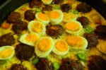 Se pun cele 4 oua la fiert . Se curata . Puneti cartofii noi bine spalati la fiert in apa sarata impreuna cu patrunjelul verde .Cand sunt fierti se scurg si se taie in doua . Amestecati carnea de mititei cu ou , ceapa tocata , cimbru ,pesmet si boia iute . Formati cu mainile unse cu ulei...