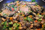 Legumele se curata, se spala si se toaca marunt. Carnea se feliaza si se absoarbe de umiditate cu ajutorul servetelor. Sarati si piparati carnea. Dati carnea prin faina. Scuturati de excesul de faina si prajiti pe ambele parti in ulei incins cate 2 minute. In uleiul...