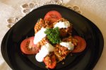 Kapia se curata, se spala, se taie jumatati, se pun in tava. Vinata si dovlecelul se spala, se curata, se scobesc si se aseaza in tava . Sarati legumele. Carnea de curcan se macina impreuna cu jumatate din patrunjelul verde si miezul vinetei si al dovlecelului [ ramase de la...