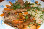 carnea se spala si se portioneaza , legumele se curata , se spala se maruntesc ,[ morcovii se taie fasii ] se pun la fiert intr-o cratita cu apa sa acopere compozitia sare , piper si putin ulei .Se lasa la fiert 45 min acoperite cu un capac , se incearca daca carnea e fiarta ....