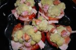 conopida se spala , se desface buchetele si se fierbe in apa cu sare . rosiile se spala , se taie un capac si se curata de seminte,se sareaza ,apoi se umplu cu bacon feliat , un buchetel de conopida , carnacior taiati rondele . rosiile astfel umplute se stropesc cu putin ulei , se razuieste...