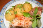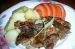 Carnatul se aseaza intreg in tava pe margini . Carnea se spala si se feliaza in felii de mai grosute de 2-3 cm.Se punein tava . Se adauga usturoiul taiat ,piper ,sare, ulei + apa sa acopere carnea si carnatul. Se da la cuptor pana carnea e patrunsa si carnatul rumenit ,...