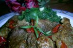 Legumele se curata , se spala .Ardeiul taiat fasii si ceapa rosie pestisori se aseaza deasupra carnii.